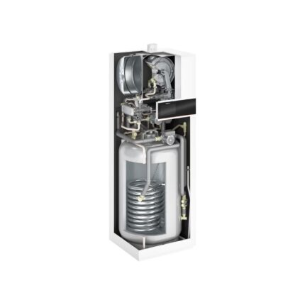 Splitové, reverzibilné tepelné čerpadlo vzduch/voda s vysoko účinným obehovým čerpadlom, s 3-cestným prepínacím ventilom, s integrovaným zásobníkom TÚV o objeme 210 l a 10 l expanznou nádobou, vrátane regulácie Vitotronic 200 WO1C pre ekvitermickú prevádzku. S elektrickým prietokovým ohrievačom 6 kW a s funkciou chladenia.